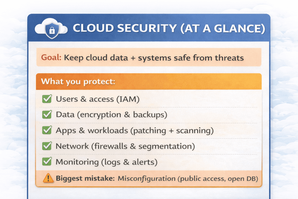 Cloud security means protecting your cloud data, apps, and accounts from threats like hacking, misconfiguration, and unauthorized access. It involves encryption, access control, monitoring, and safe configurations.