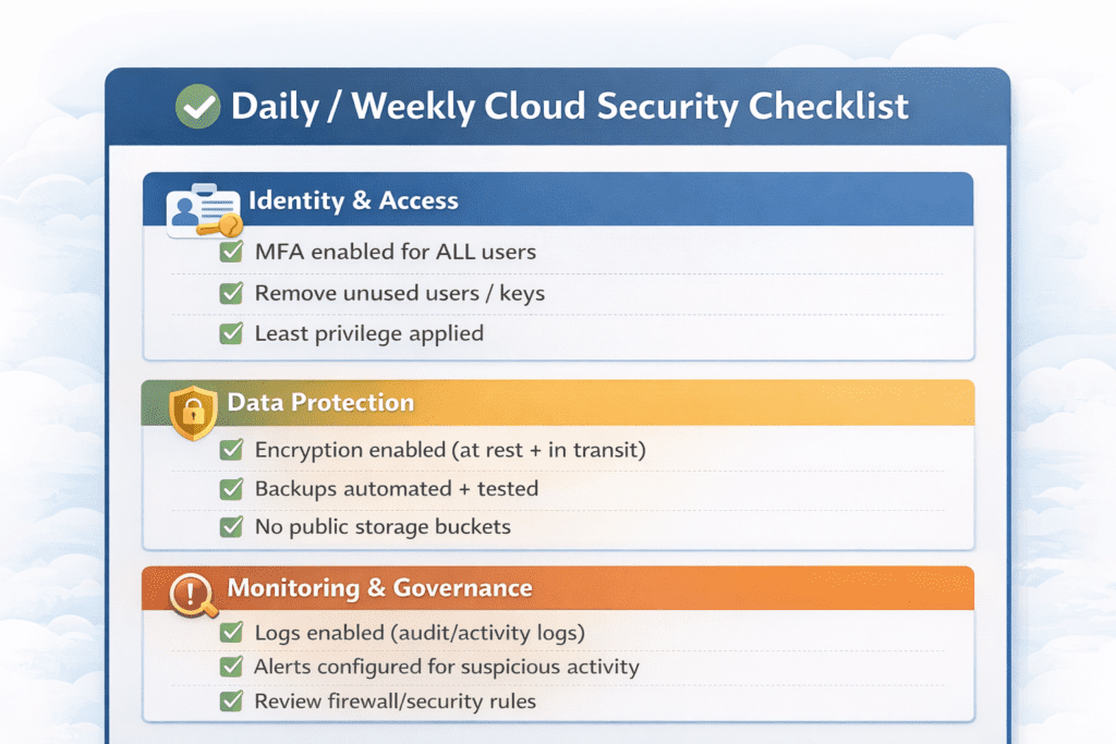 - Use a daily/weekly checklist to protect cloud environments