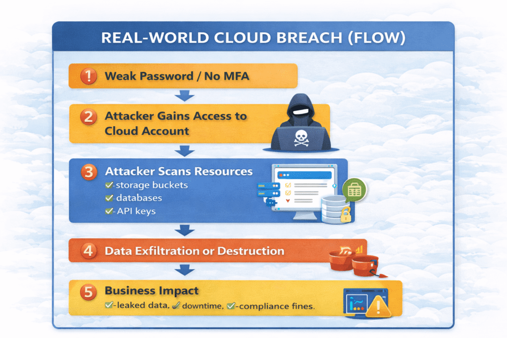 A single cloud mistake—like leaving a storage bucket public, using weak credentials, or skipping monitoring—can lead to data leaks, ransomware attacks, compliance fines, or service downtime.