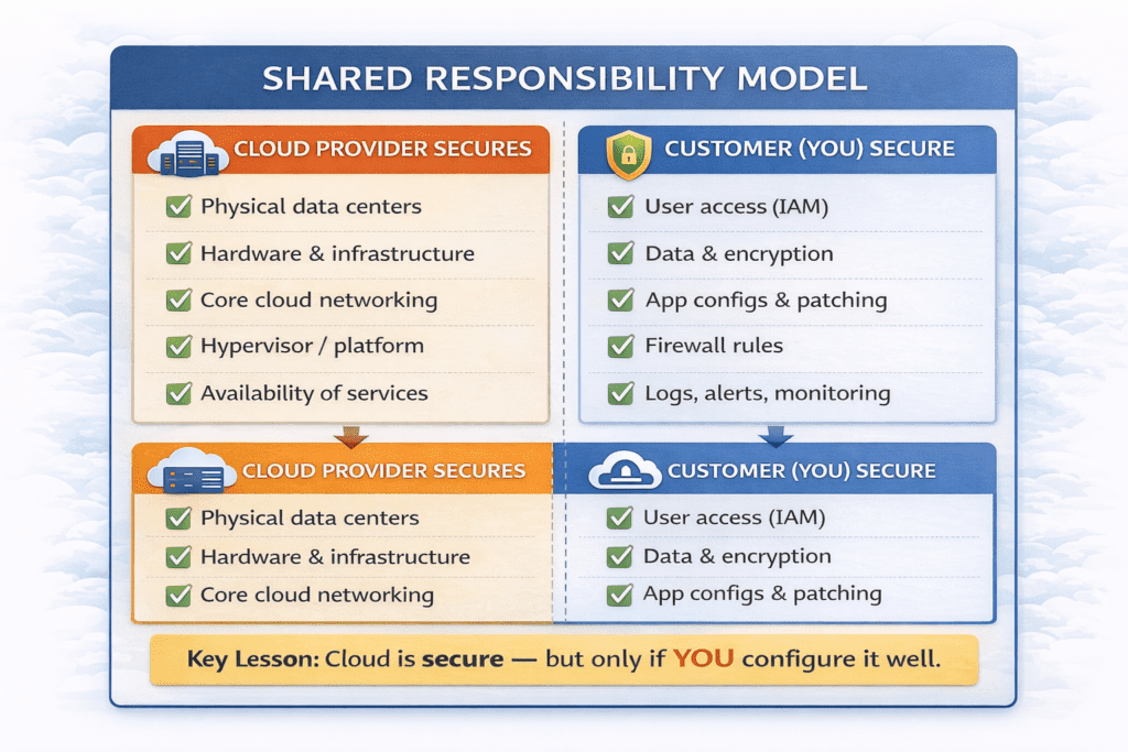 In traditional on-prem environments, companies manage physical servers, networks, and security devices themselves. In cloud environments, infrastructure is hosted by cloud providers—yet the customer still controls what they deploy and how they secure it.